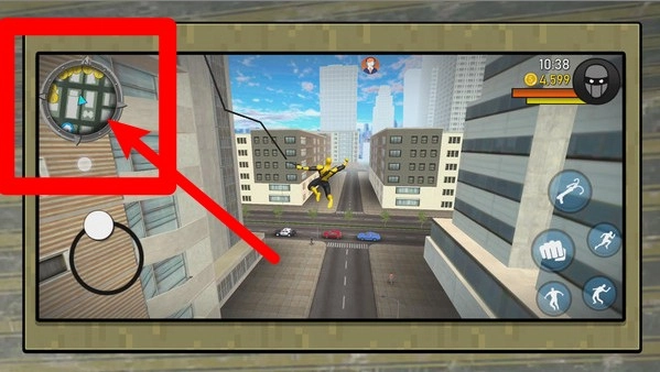 2.高空飞荡时左上角小地图显示目标位置,右上角为时间与金币,沿着标记快速前进抵达任务触发事件。