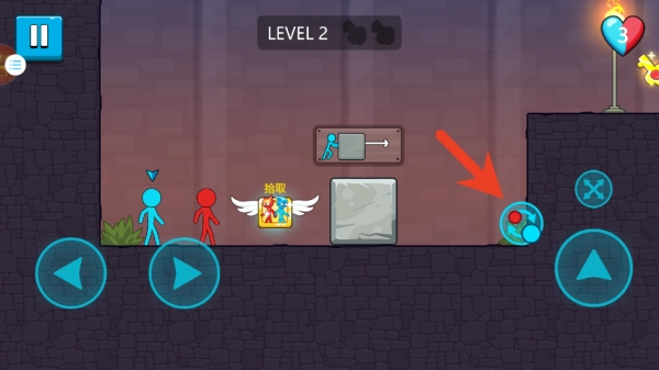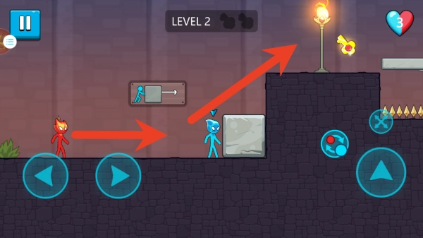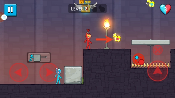 3、通过推动箱子来触发机关,以接力的方式传递道具,借助角色各自的特性(像红人力量较大,蓝人跳跃能力强)相互配合进行解谜。
