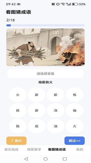 3、在看图猜成语页面,则支持趣味成语闯关模式。
