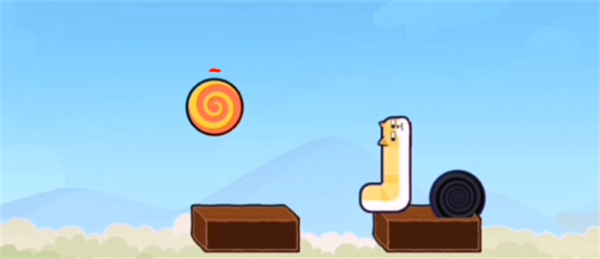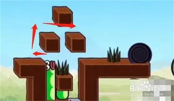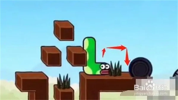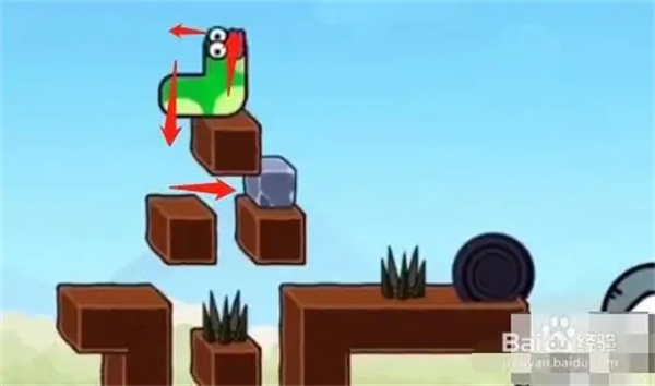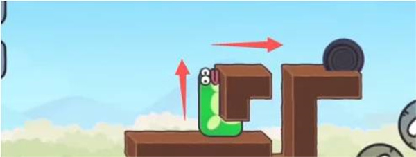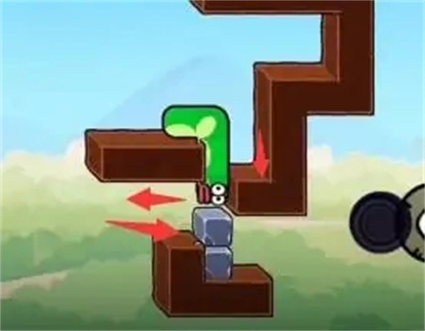 2、我们让小蛇向右上移动翻转调整好身体方向之后再直行顶下石头,如图所示。
