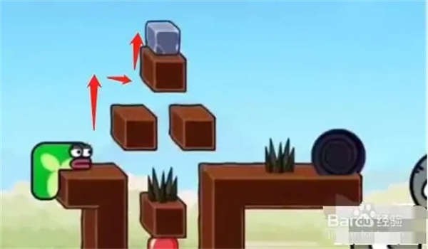 3、接下来,我们直接向前走,把石头顶下去,盖住尖刺,然后往左边移动,就能吃掉苹果了。
