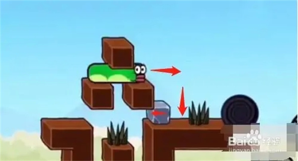 1、首先我们操控小蛇往上走到最上边的一层去将石头顶下去,如图所示的操作流程