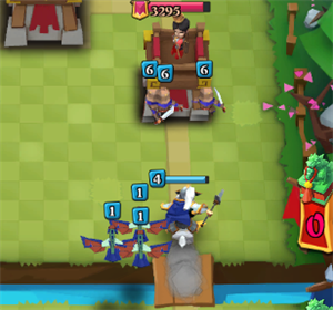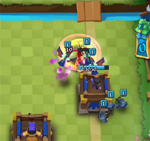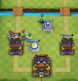 战斗界面相当简单。开始后,双方各有2个防御塔和1个皇帝塔,摧毁弓箭防御塔可以得到1个玉玺,直接摧毁皇帝塔可以获得3个玉玺。在标准3分钟的时间限制下,最先获得3个玉玺或获得玉玺数多的玩家获胜,若双方平手的话,可以获得1分钟的额外加时赛。如果最后还是平手,那么此次对战则为平局,双方都得不到声望。需要注意的是,标准3分钟的最后1分钟和加时时间里,粮草增长速度是翻倍的,这段游戏时间里双方交战会更加频繁,游戏体验会更加紧张刺激。