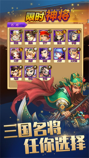 全民三国大战最新版本,是一款极具经典韵味的角色扮演类手游。这款游戏以卡通风格的画面呈现,游戏里有着大量三国经典角色。每个角色都具备独特的技能,而且获取角色的方式十分简便,玩家能够通过商城抽奖或者直接购买来获得,爆率相当高,是一款趣味性十足的手机游戏。