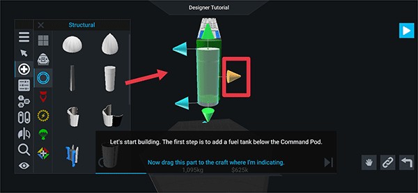 3.进入后,根据提示,在指挥舱下方添加一个燃料箱。点击加号按钮,从“structural”分类中选择合适的部件