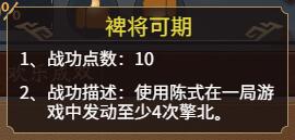 3.单将单挑能力不足的武将:陈式进入残局单挑后,单挑能力很强,属于顶级的一批(但是单挑难度极高),残局中的陈式尤其是单挑是非常强势的,尽快进入残局人少的局是陈式追求的情形之一。