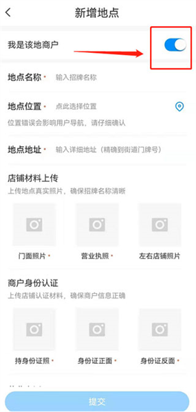 5、进入后先将我是该地商户右侧按钮开启,然后根据下方要求填写内容