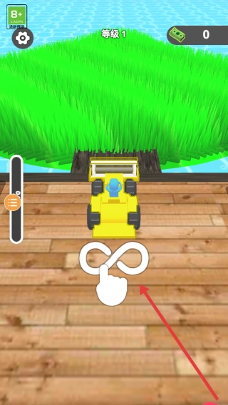 1、在主界面中,通过滑动白色无限符号来操控黄色割草车驶向绿色草地,启动割草作业并收集草垛,以此推进等级1的任务流程。