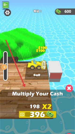 3、卖草后触发Multiply Your Cash,可选看广告翻倍金币396→792,积累资金升级车辆、解锁新玩法。