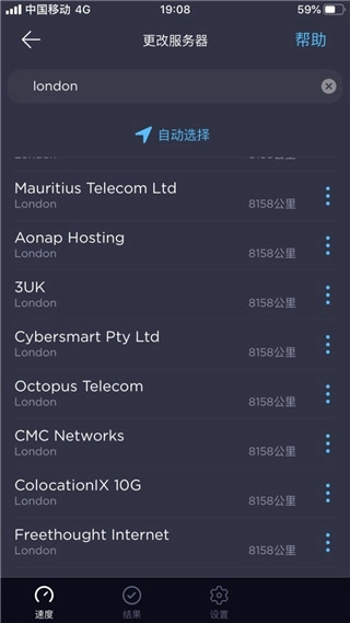 1、更换测速点:点击开始画面里的【更换测速点】,选择其他的测速服务器。比如你想知道到英国London的网速如何,只需要输入London,然后选择一个在London的测速点,比如3UK。