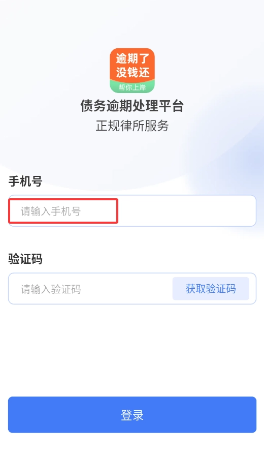 1、打开债务逾期处理平台后,在登录界面输入本人已完成实名认证的手机号码,以此完成身份验证。