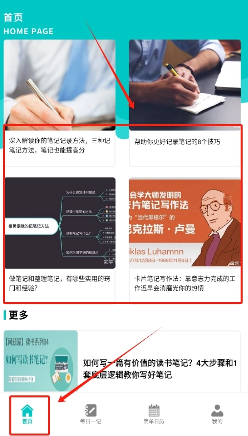 1、打开小鱼爱笔记软件,映入眼帘的首页有记笔记方法与好处的介绍,助你开启记录之旅。