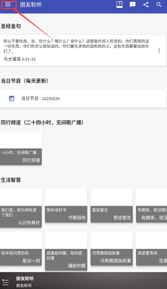 进入朋友聆听应用后,点击界面左上角的菜单图标,就能快速回到主页面查看所有内容。