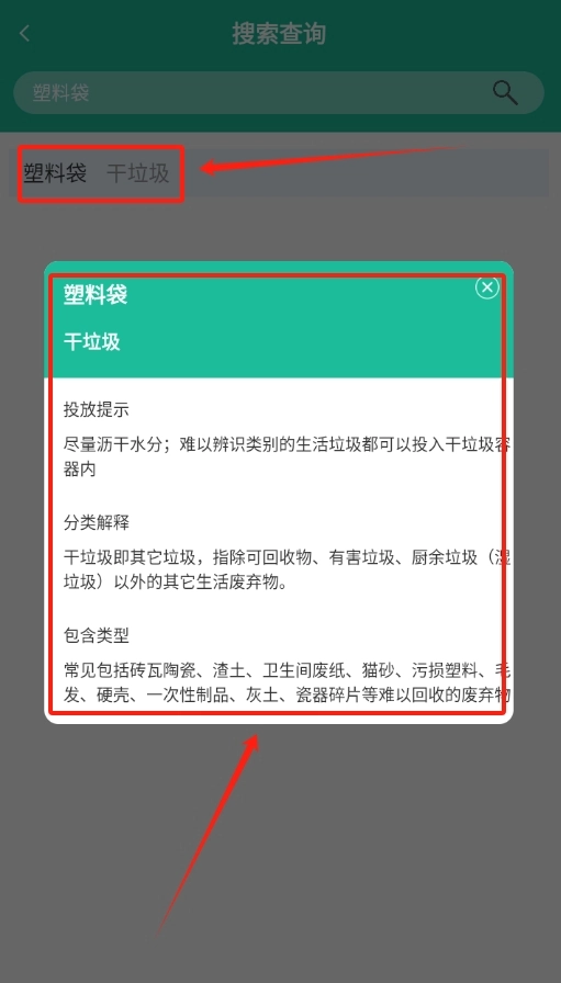 打开软件进入首页后,点击“塑料袋”选项可以查询对应的垃圾类别,点击“垃圾桶”选项则能查看该垃圾桶可容纳的垃圾种类。