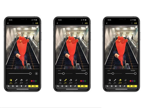 2、选择需要处理的照片并点击,这时你就来到了编辑的界面了。你会看到在界面中有很多的按钮,接下里我就来告诉你它们分别有什么用。总过六个部分,每个部分都用了形象生动的图表来标注了,便于用户识别。
